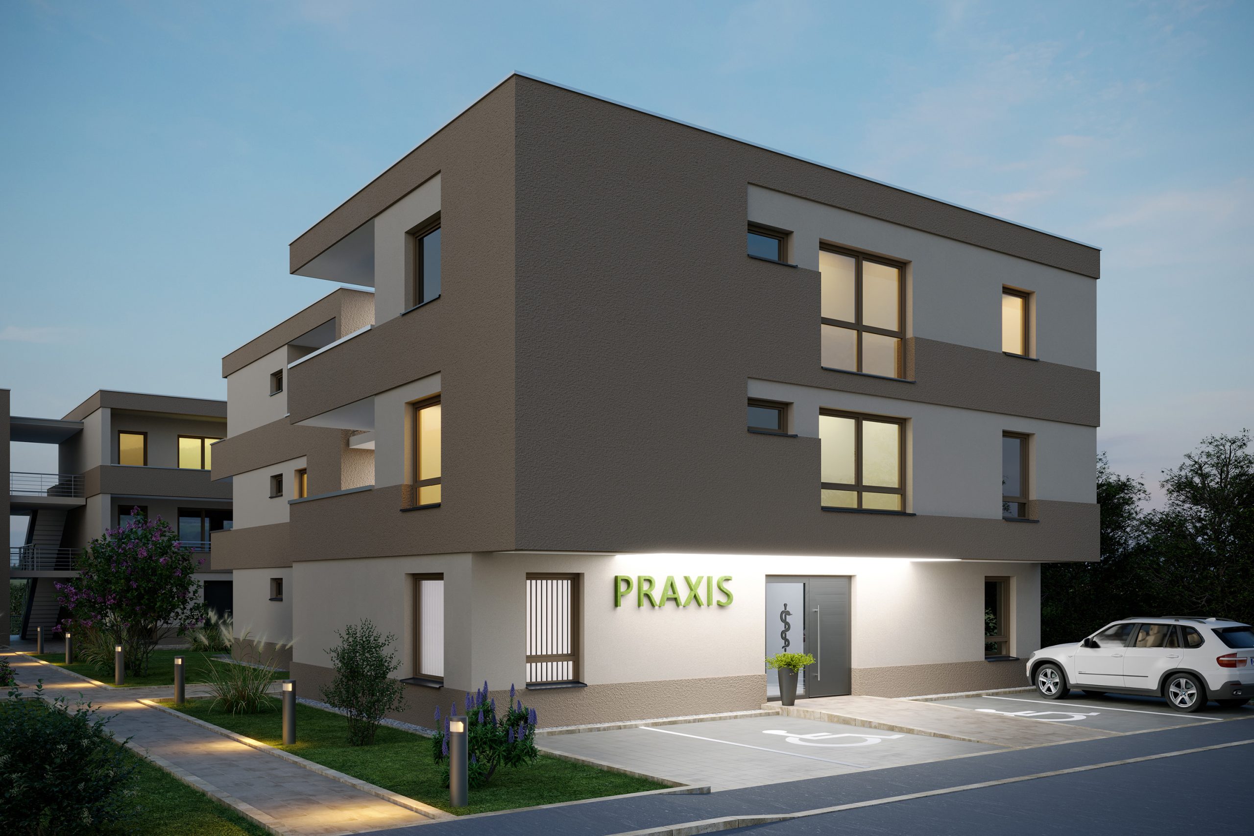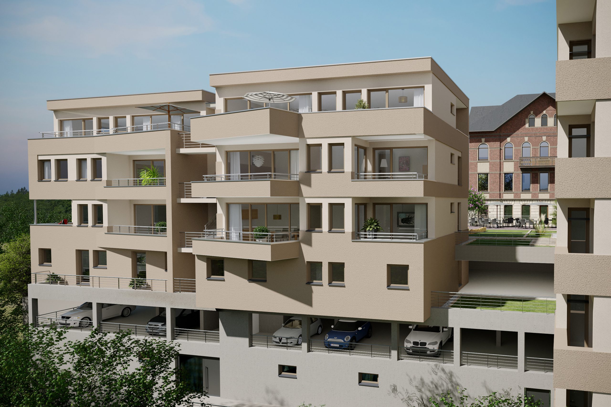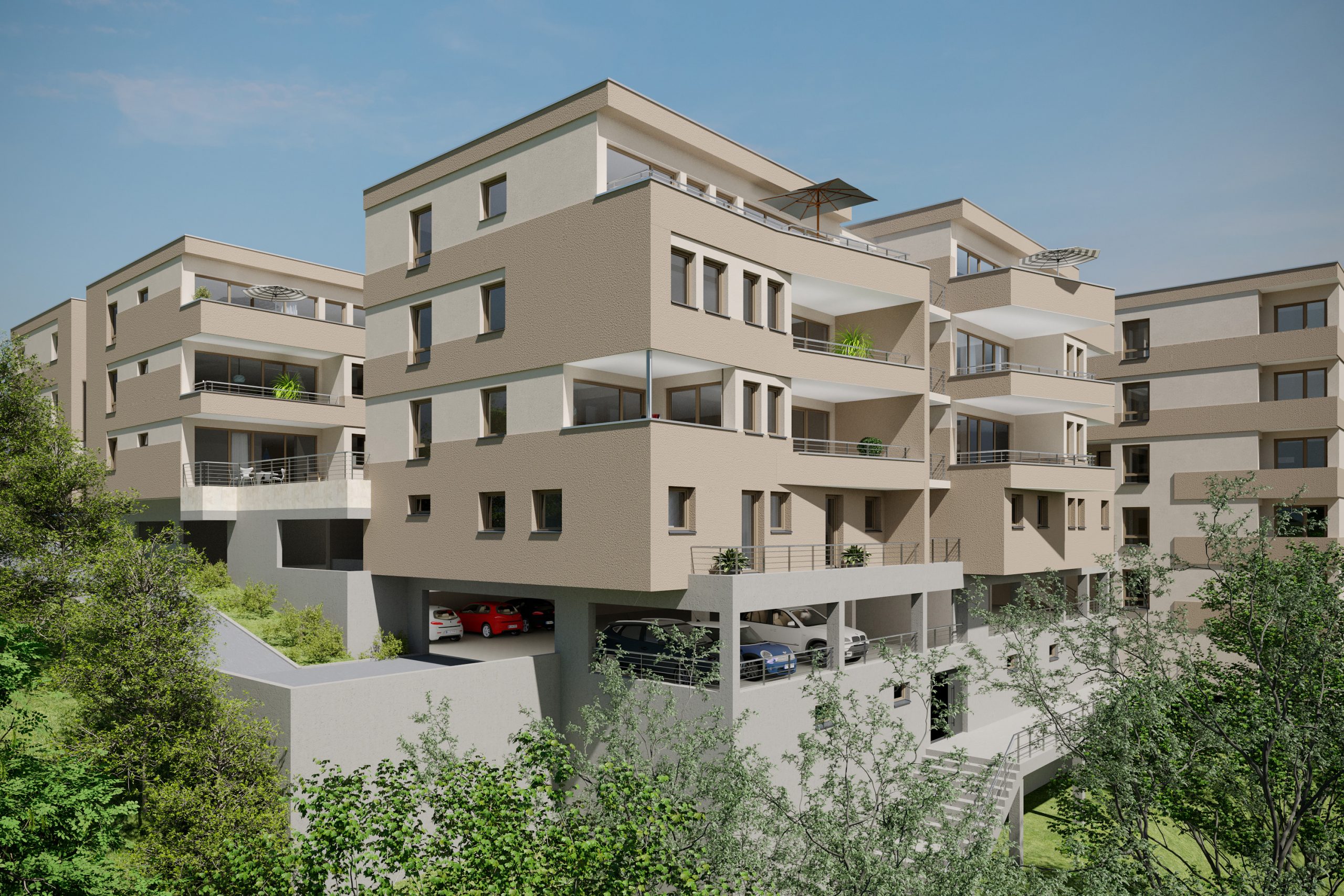 Alle Einheiten lassen sich trockenen Fußes bequem per Aufzug von der überdachten Stellplatzfläche mit insgesamt 59 Parkplätzen erreichen, welche sich aufgrund der Hanglage unsichtbar unter dem begrünten Innenhof mit Spielplatz und Bänken verstecken. Zur Praxis bzw. den Clusterwohnungen stehen darüber hinaus 4 überirdische Stellplätze zur Verfügung.